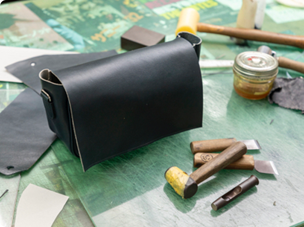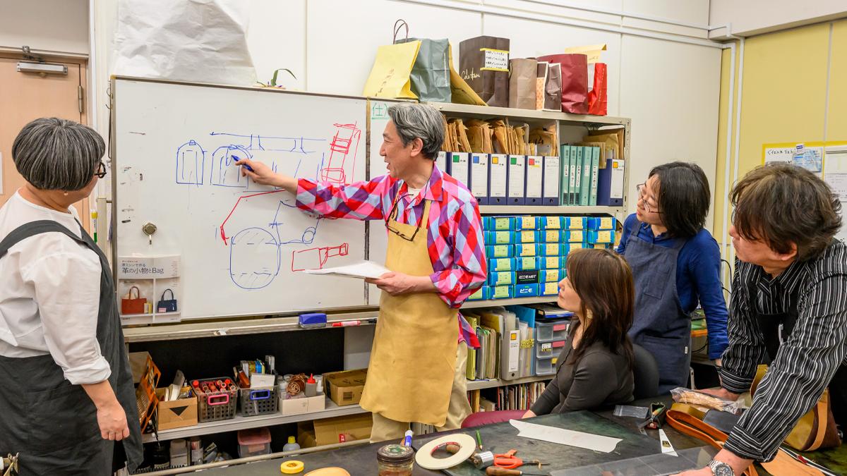 当教室は、自分の中にある「革製品を作りたい」気持ちを自由に発現させることのできる、稀有なスクールです。生徒さんが一斉に同じものを作のではなく、好きなものを作ってもらいながら、革小物からバッグ、旅行鞄などのつくり方をマンツーマンで指導します。革包丁の手入れをして革を切ることから始め、応用の利く型紙づくり、ミシンによる仕立てと革漉き、最終仕上げに至るまで、一つひとつの技術を論理的にきちんとお教えするのが当教室の特長です。